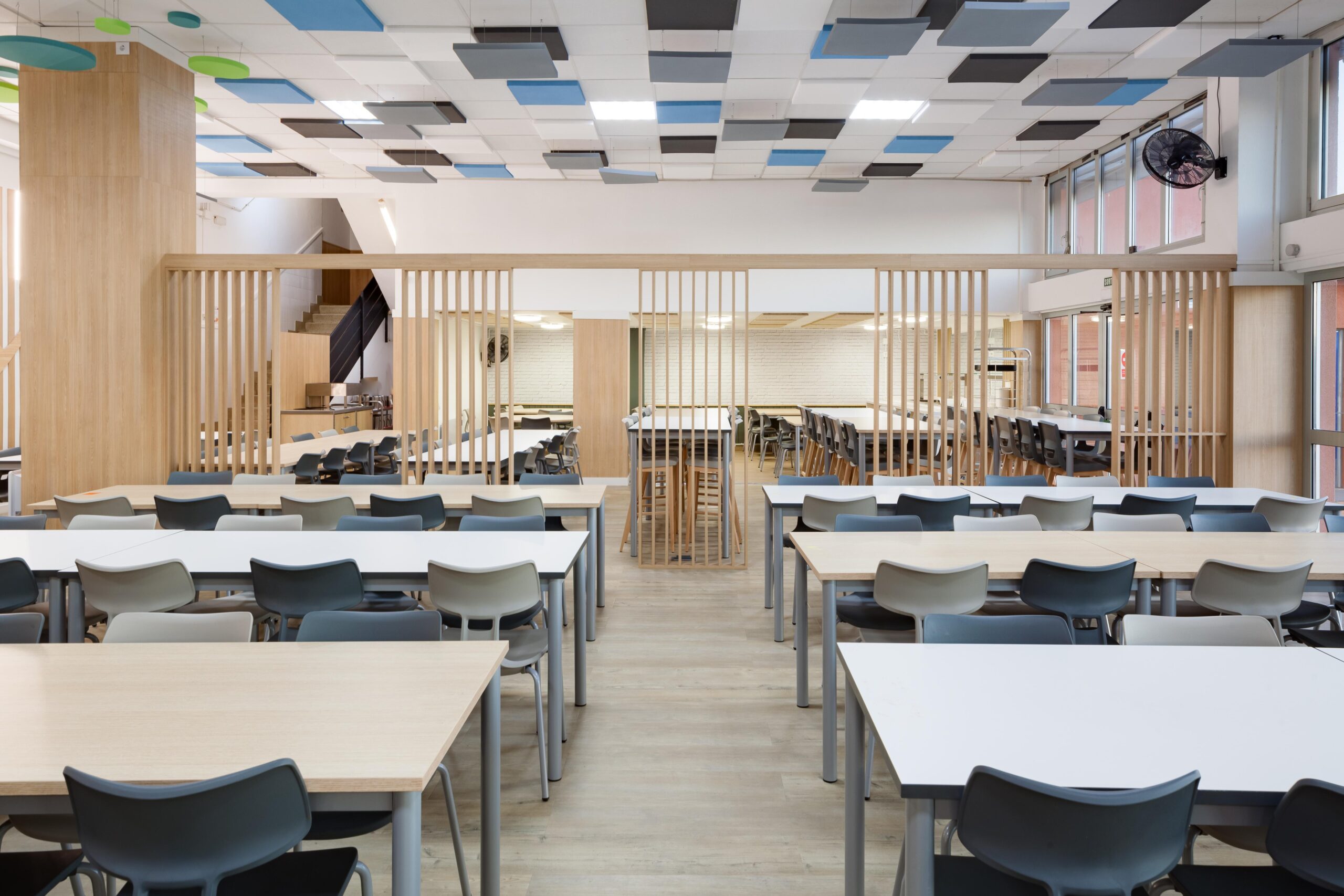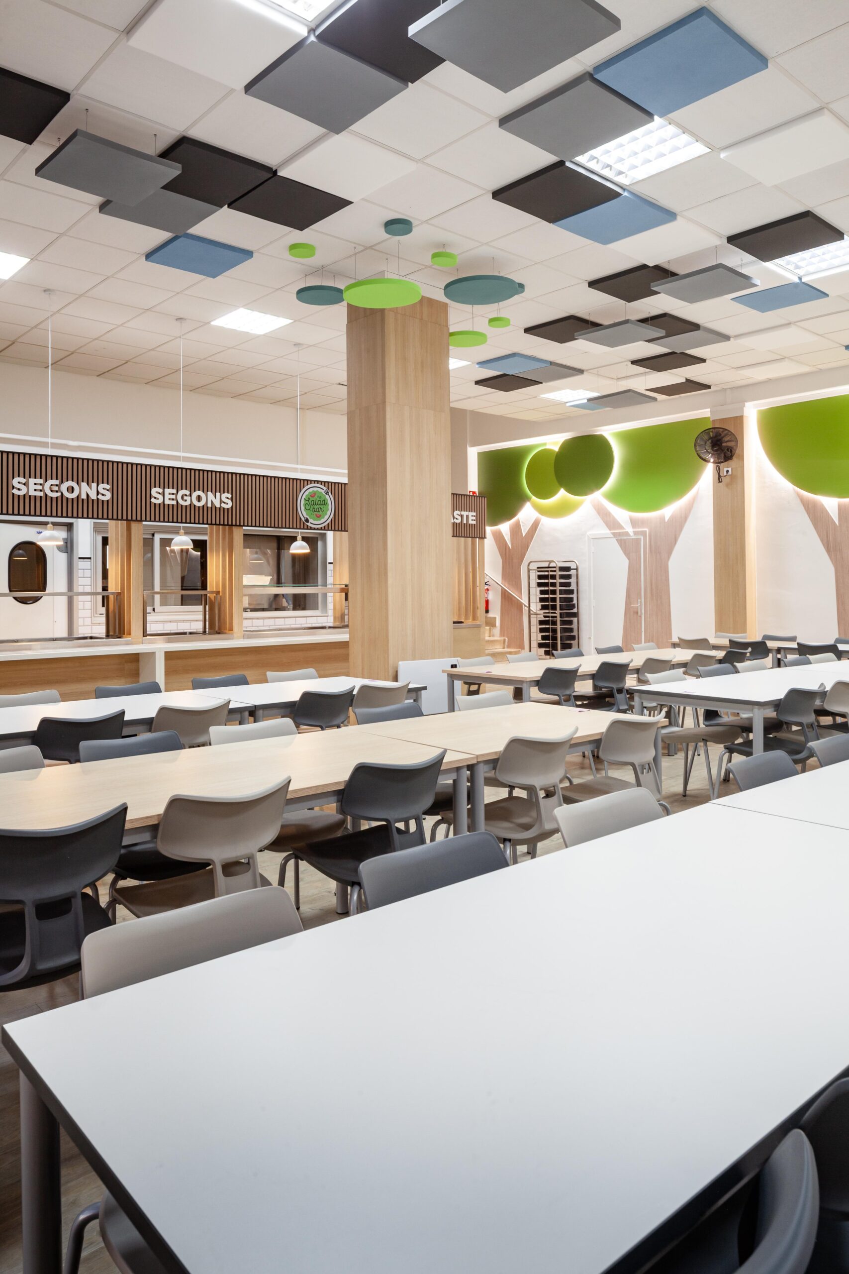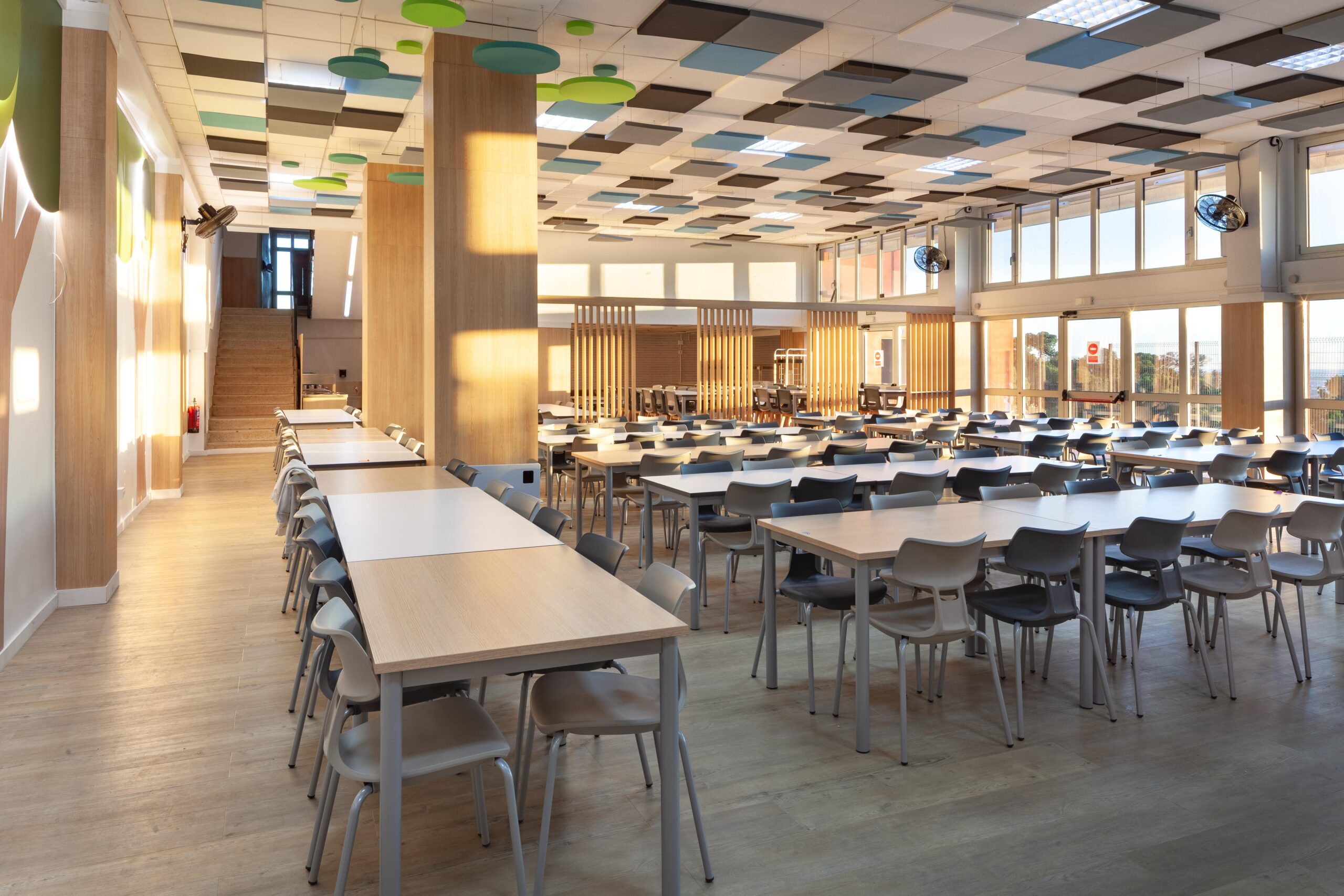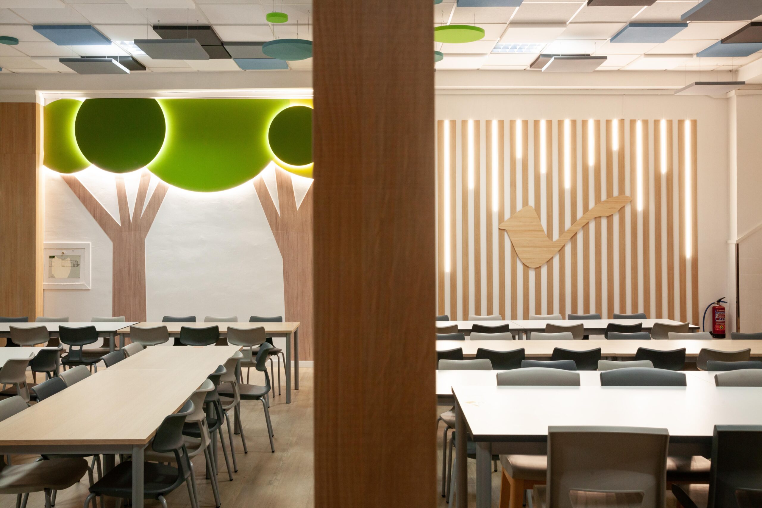 El falso techo, resuelto con paneles acústicos suspendidos en diferentes tonos, no solo controla la reverberación propia de los comedores escolares, sino que también organiza el espacio mediante un patrón reconocible y rítmico que transmite calma dentro de un volumen amplio.
