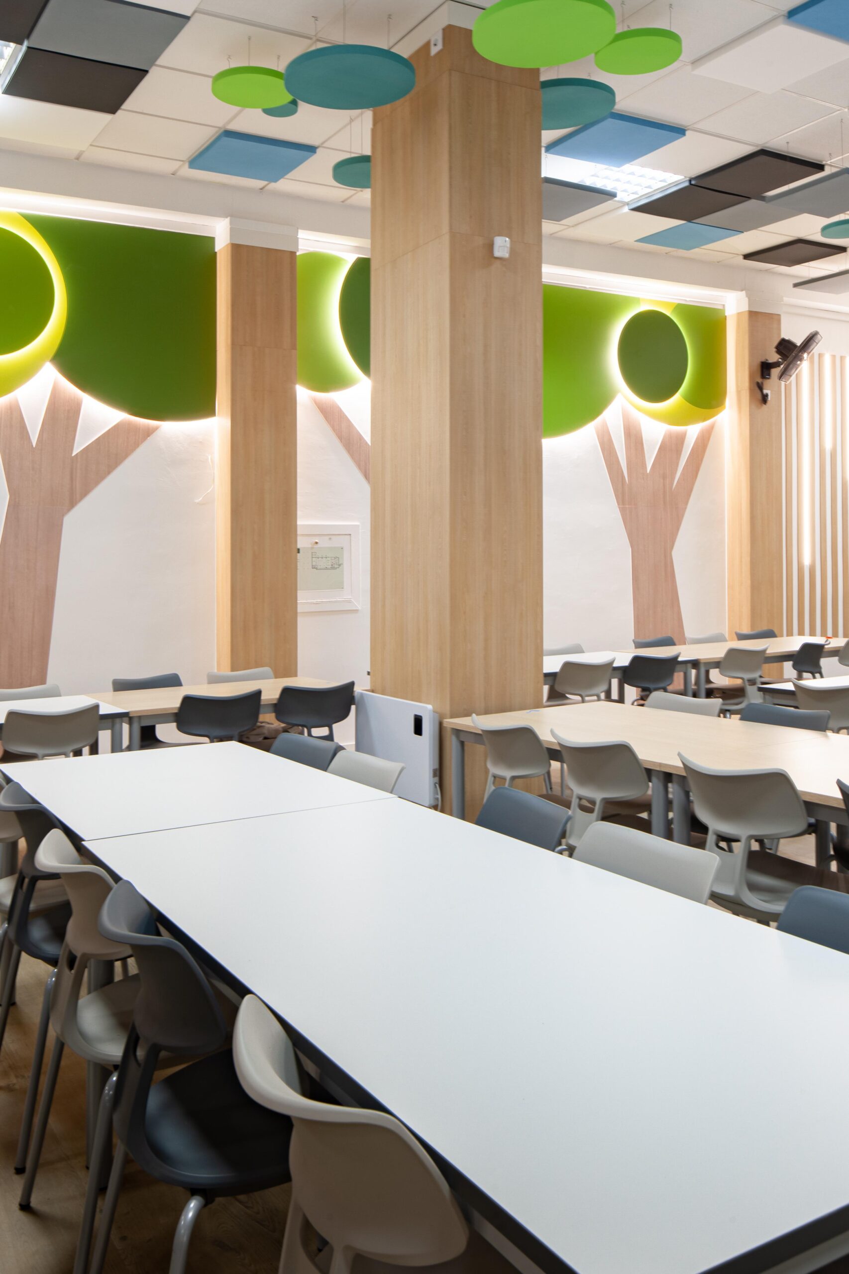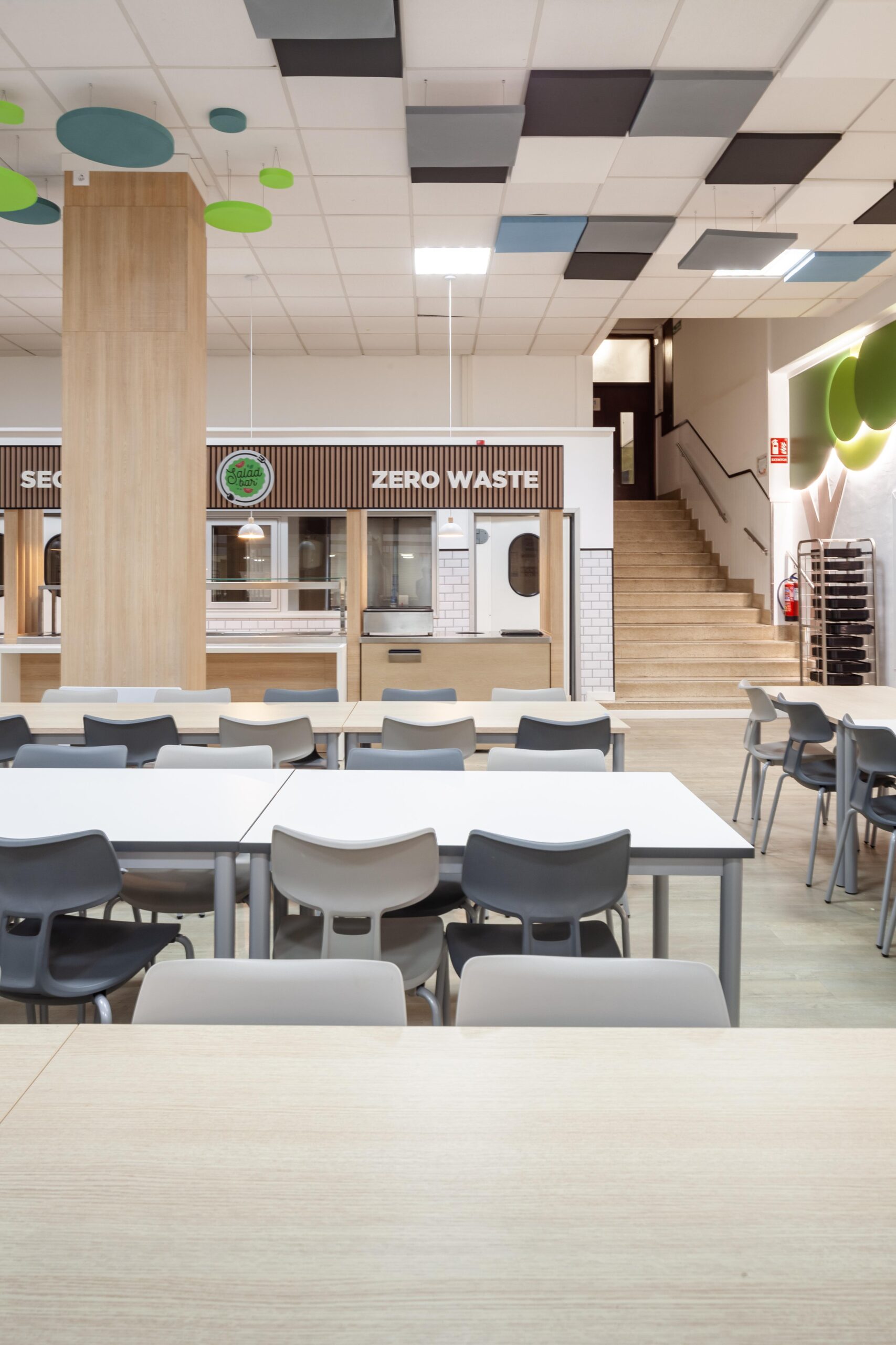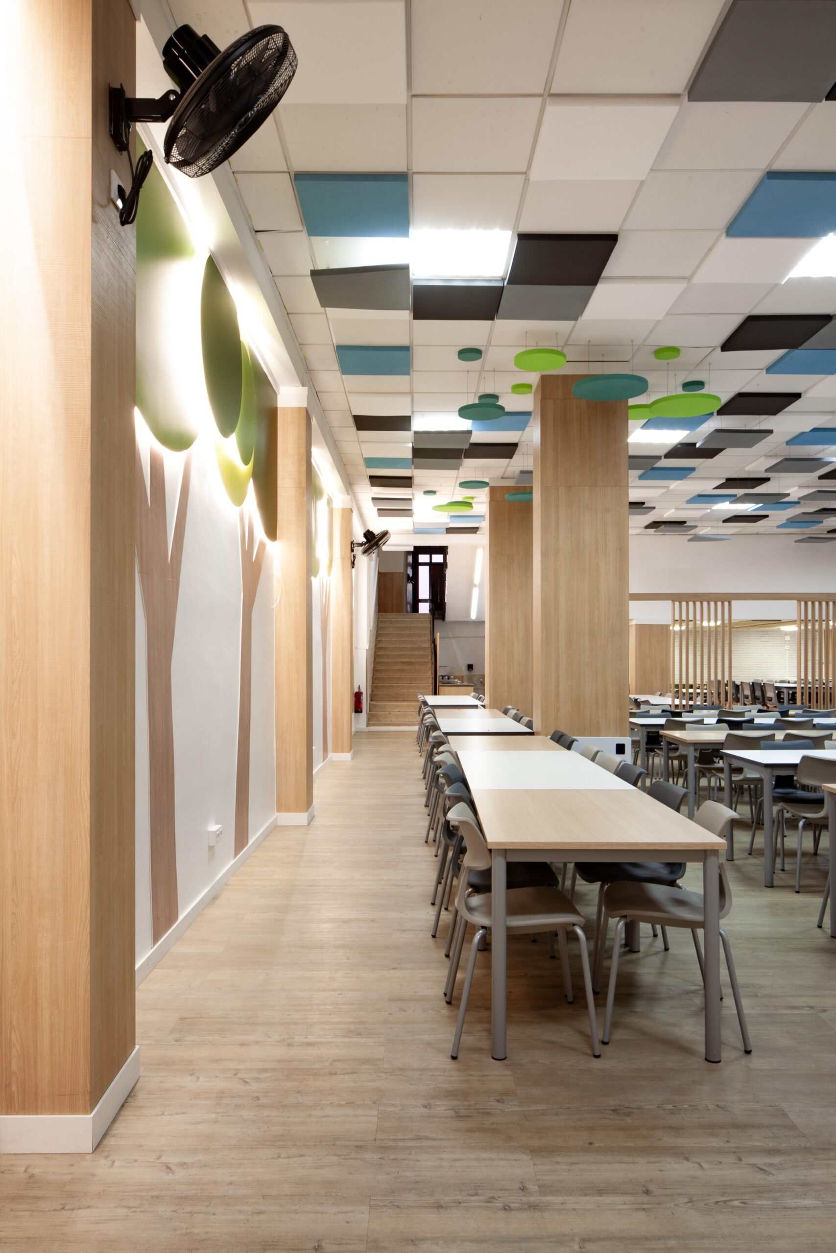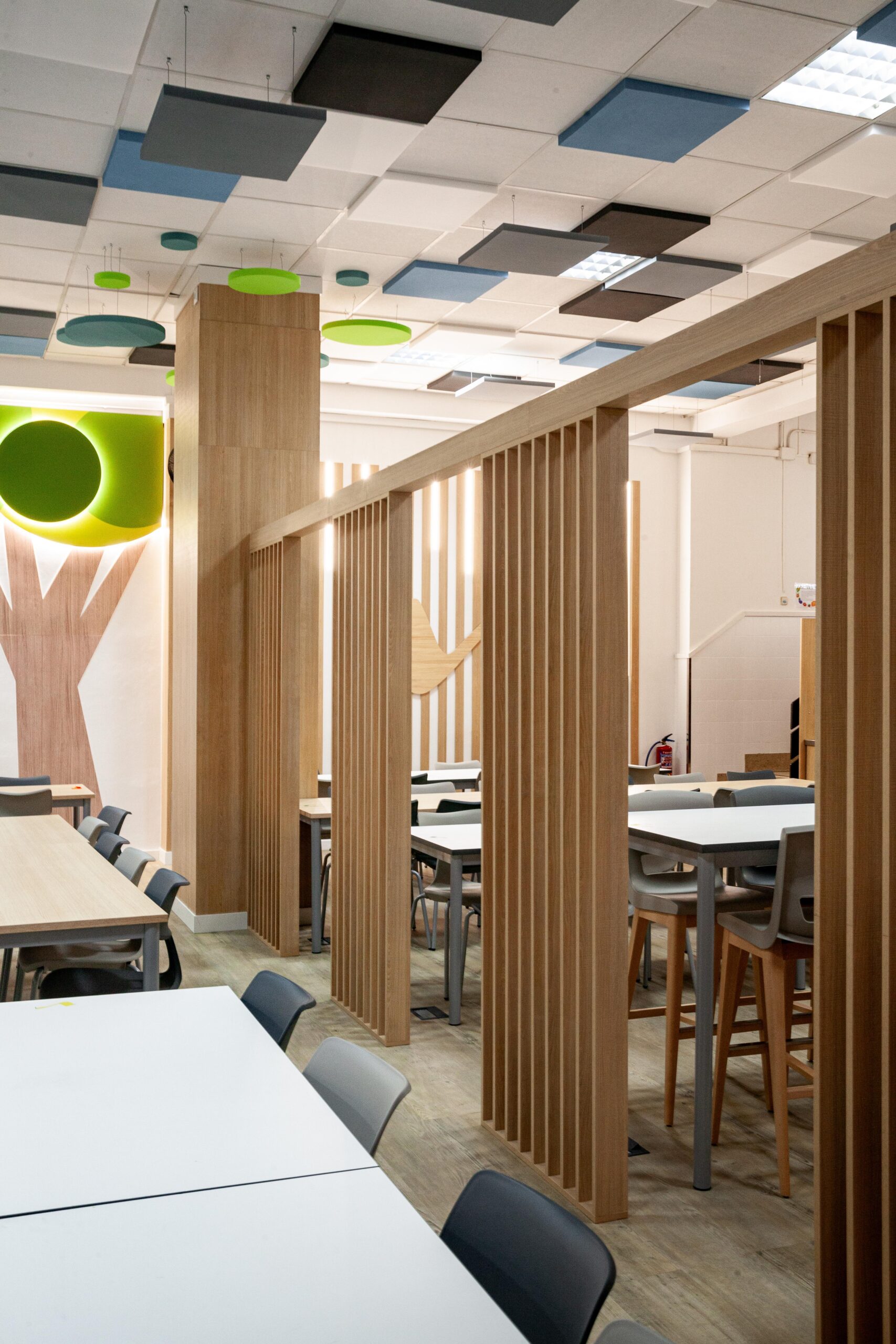 El falso techo, resuelto con paneles acústicos suspendidos en diferentes tonos, no solo controla la reverberación propia de los comedores escolares, sino que también organiza el espacio mediante un patrón reconocible y rítmico que transmite calma dentro de un volumen amplio.