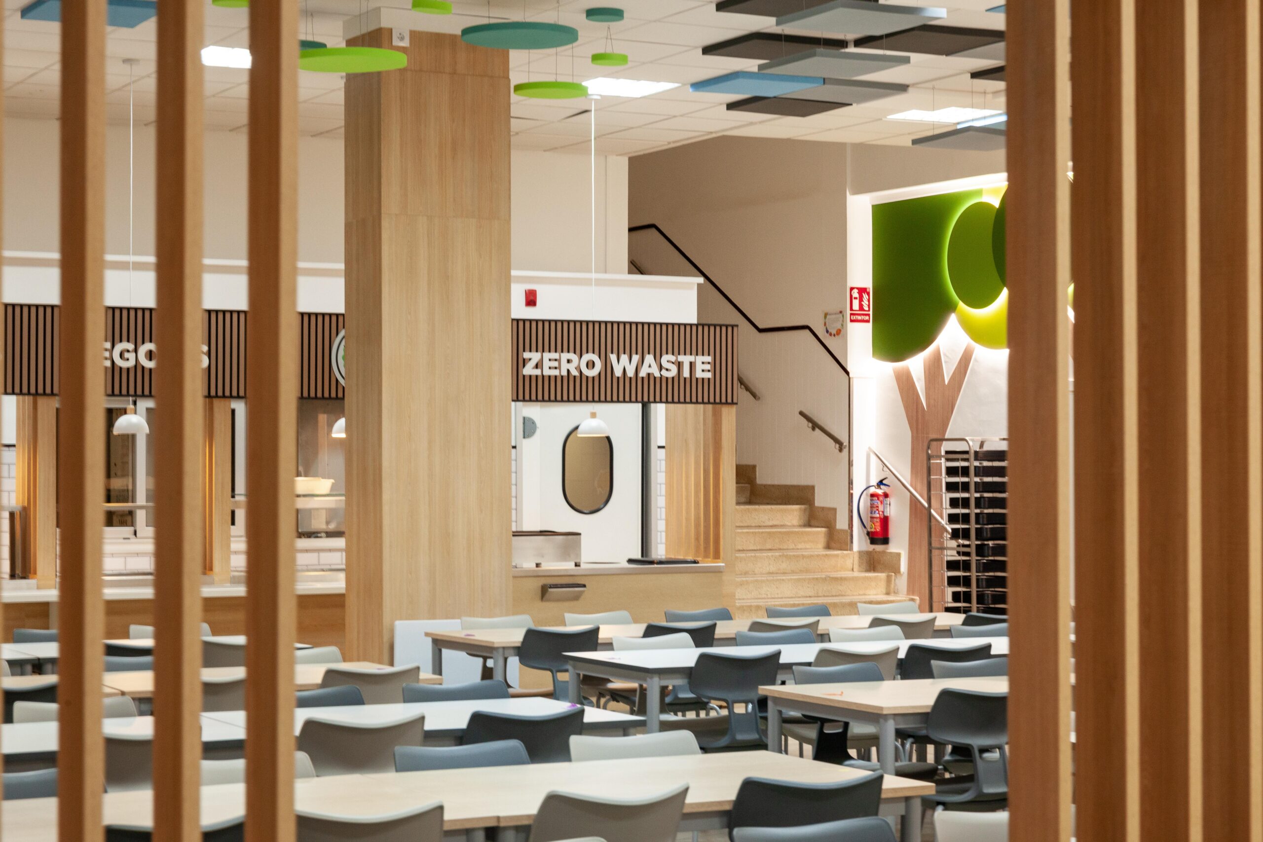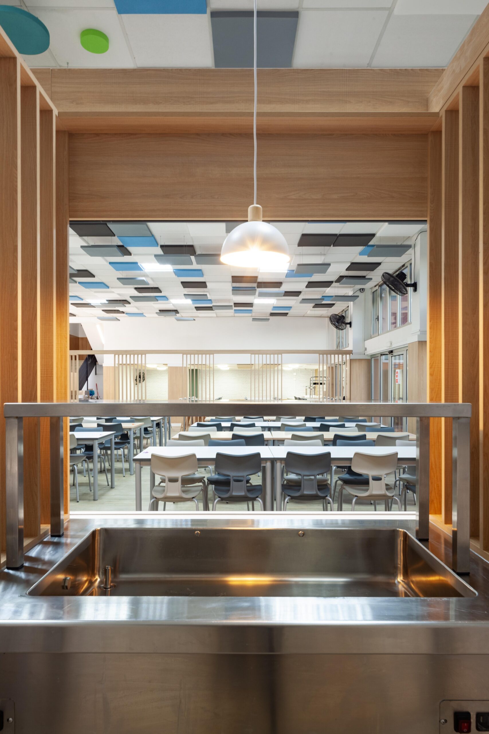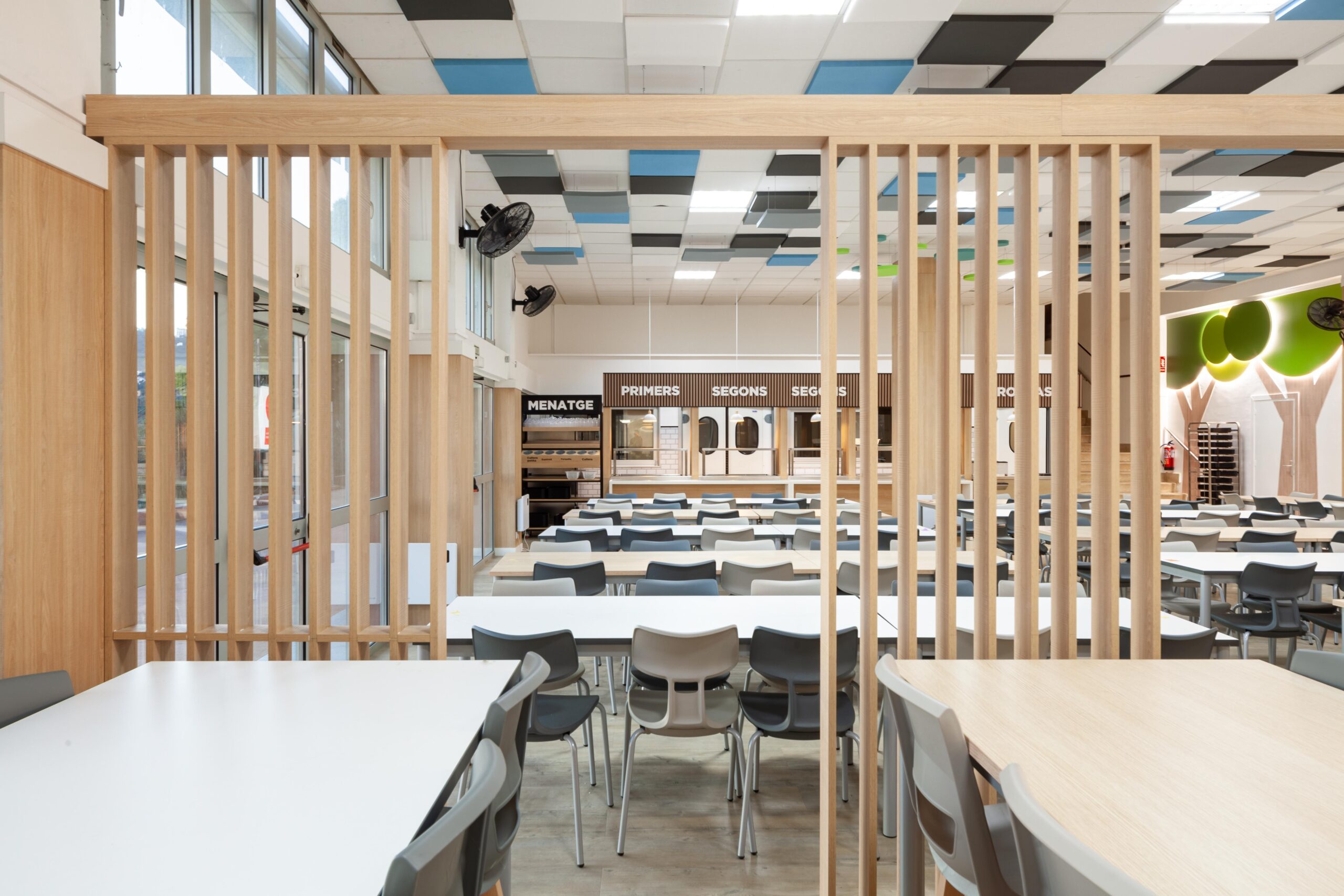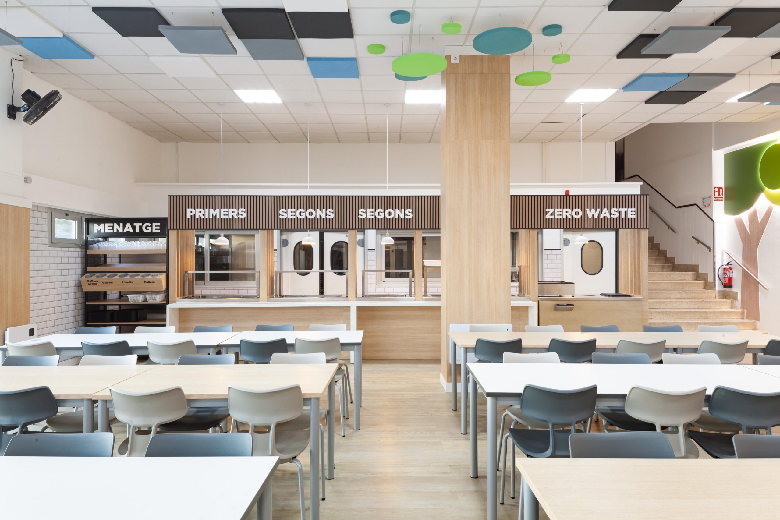 El falso techo, resuelto con paneles acústicos suspendidos en diferentes tonos, no solo controla la reverberación propia de los comedores escolares, sino que también organiza el espacio mediante un patrón reconocible y rítmico que transmite calma dentro de un volumen amplio.