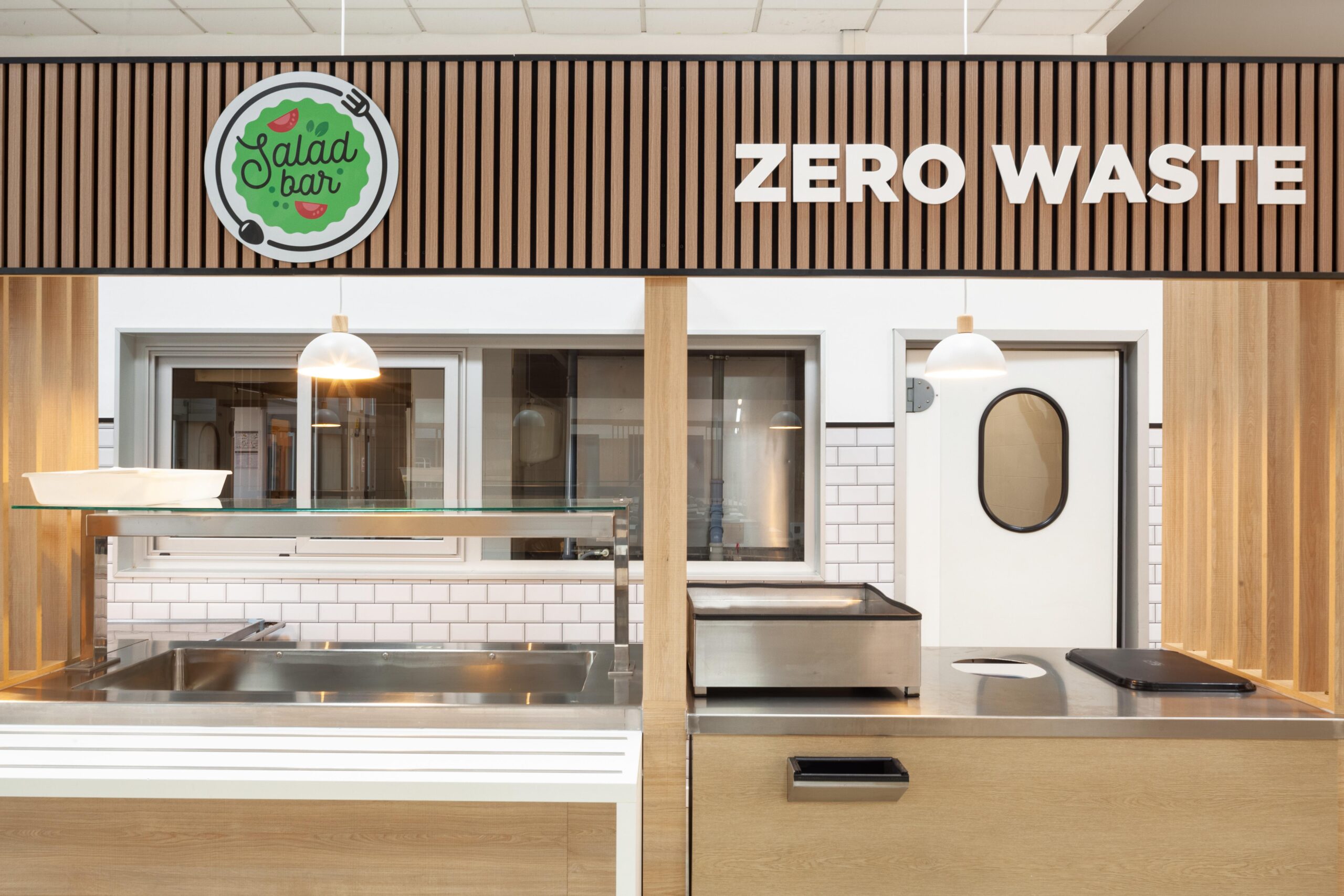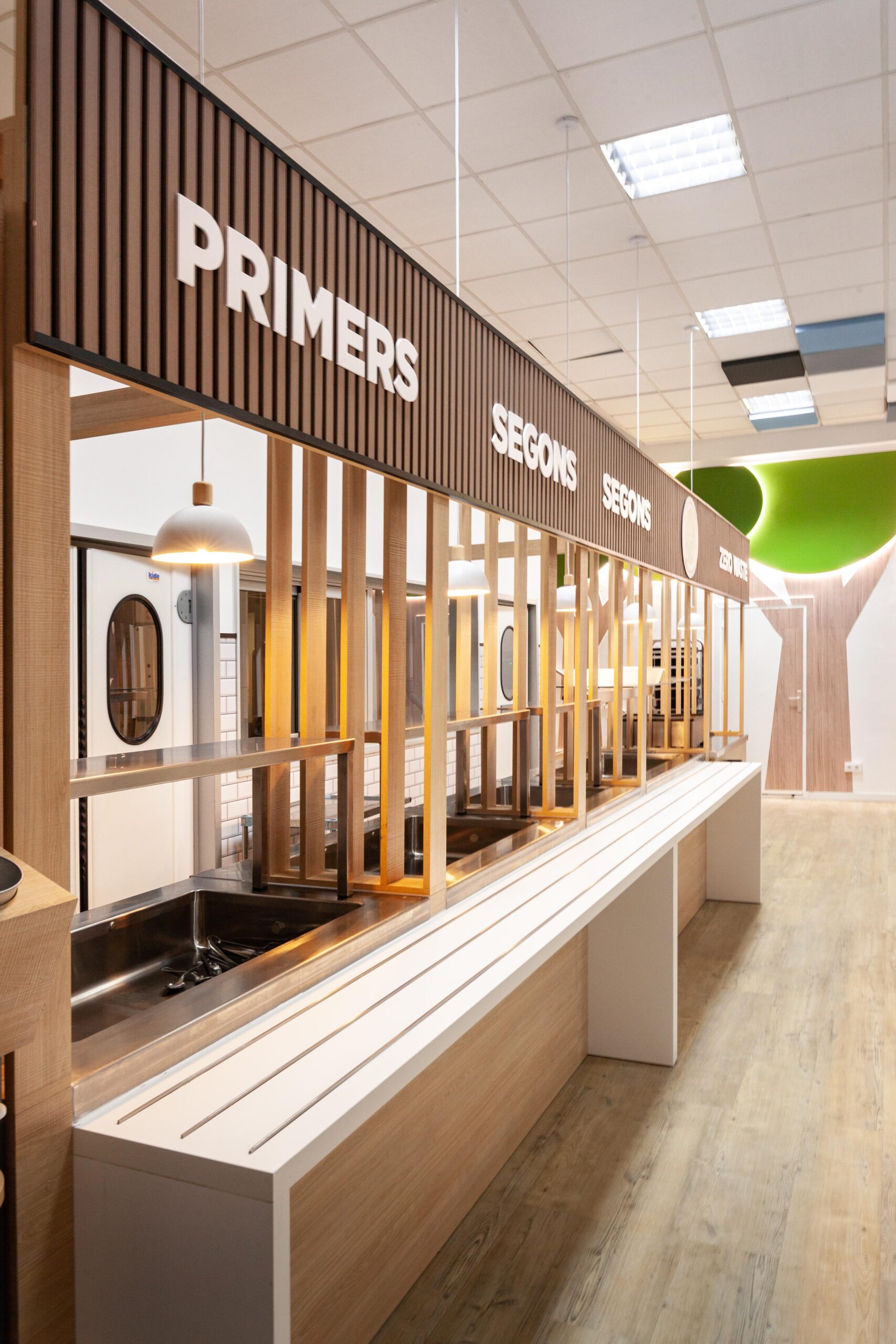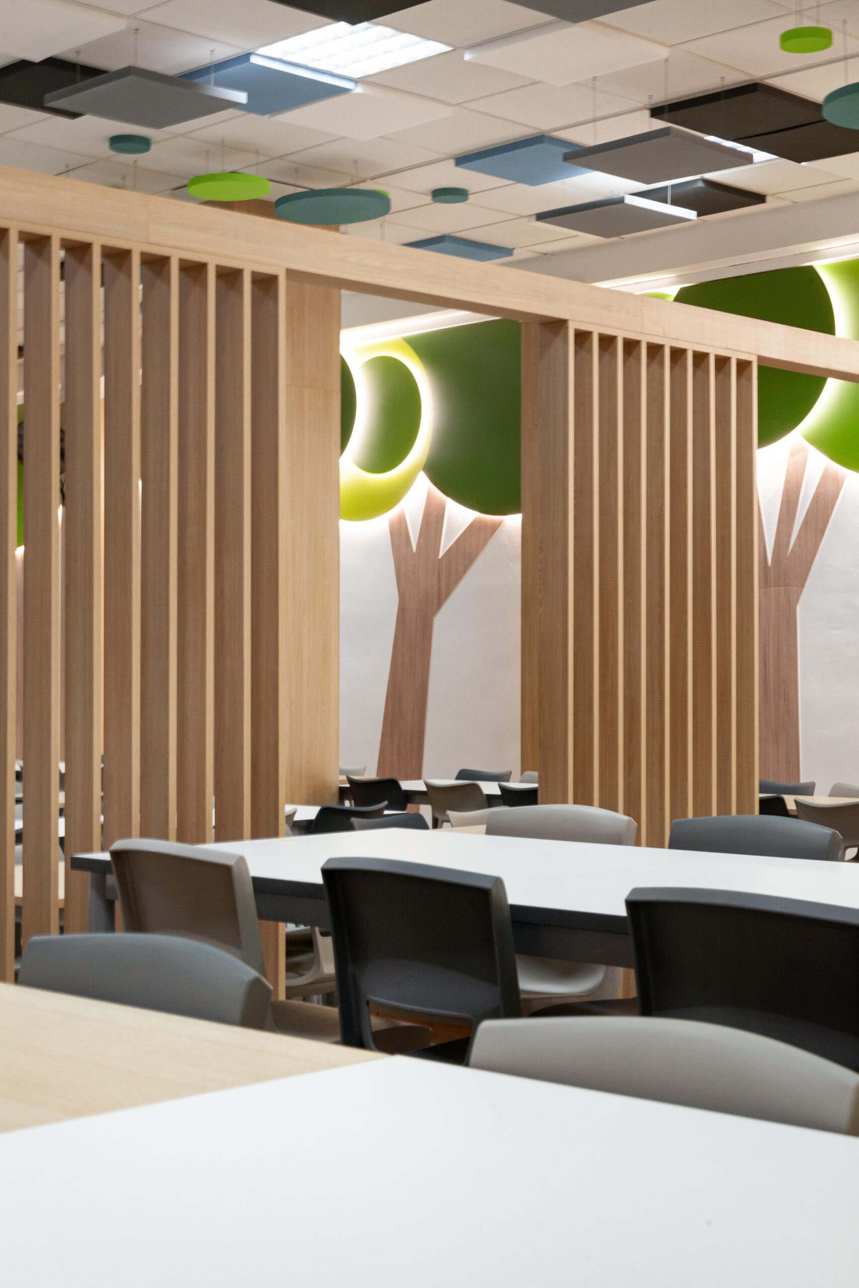 La incorporación de materiales cálidos, como la madera en pilares y celosías, suaviza la percepción espacial y aporta una sensación de confort visual. Los motivos gráficos de árboles retroiluminados introducen un guiño lúdico y natural que humaniza el ambiente sin saturarlo.