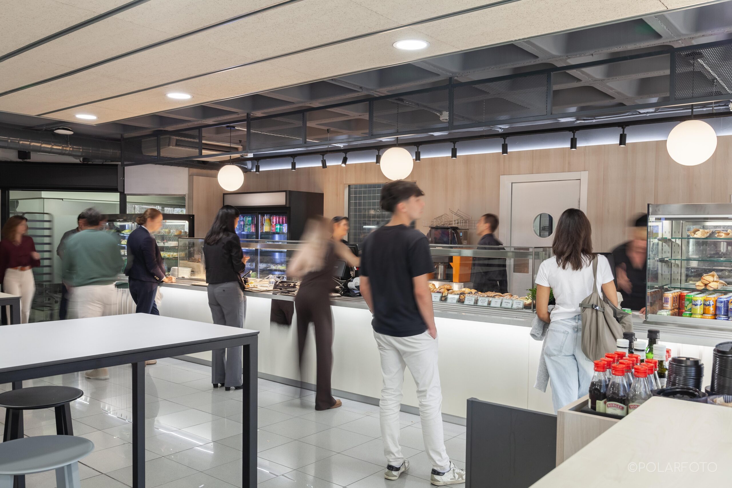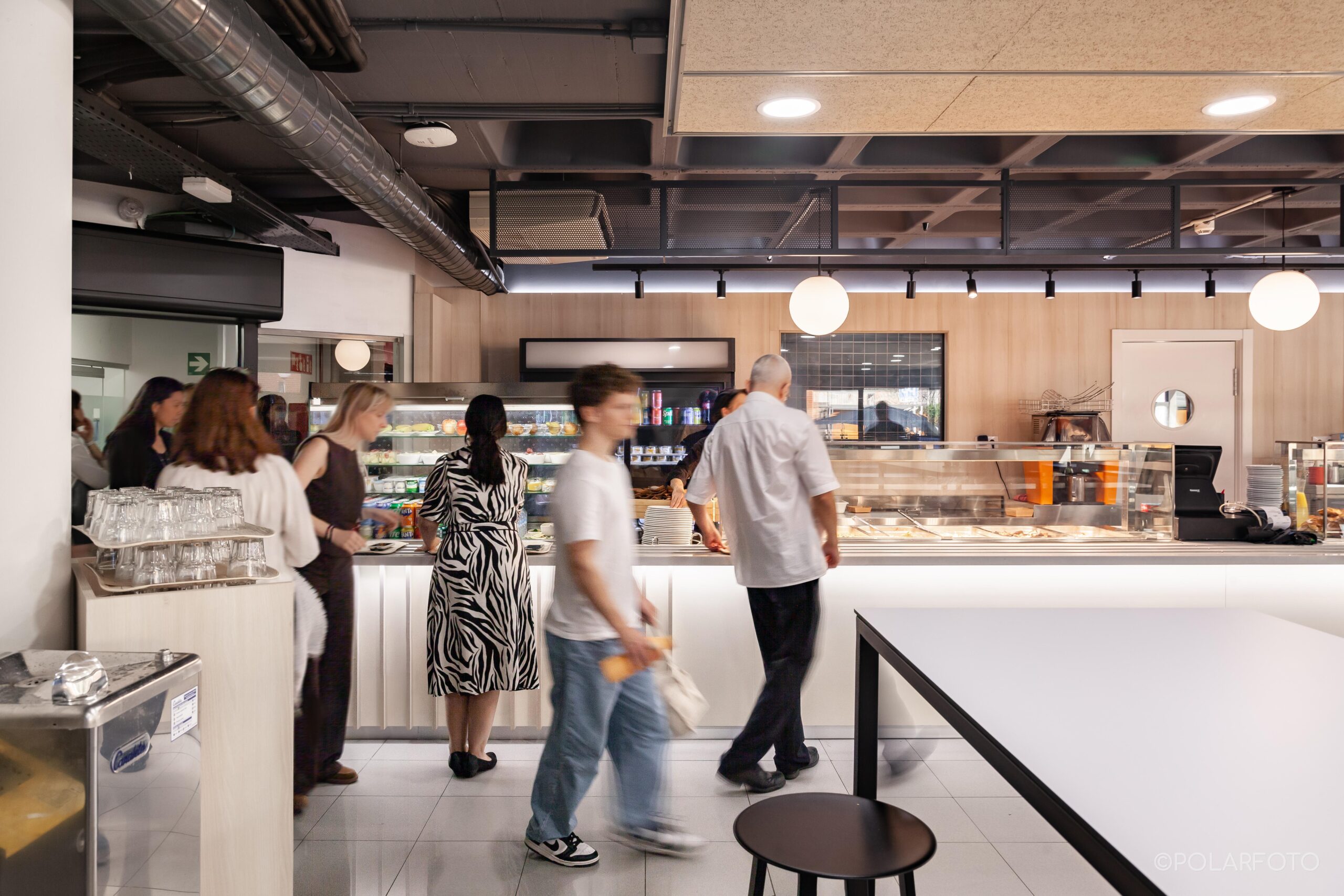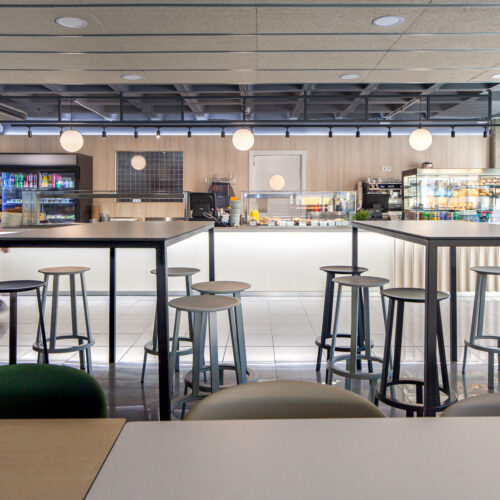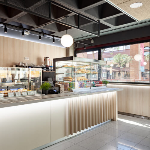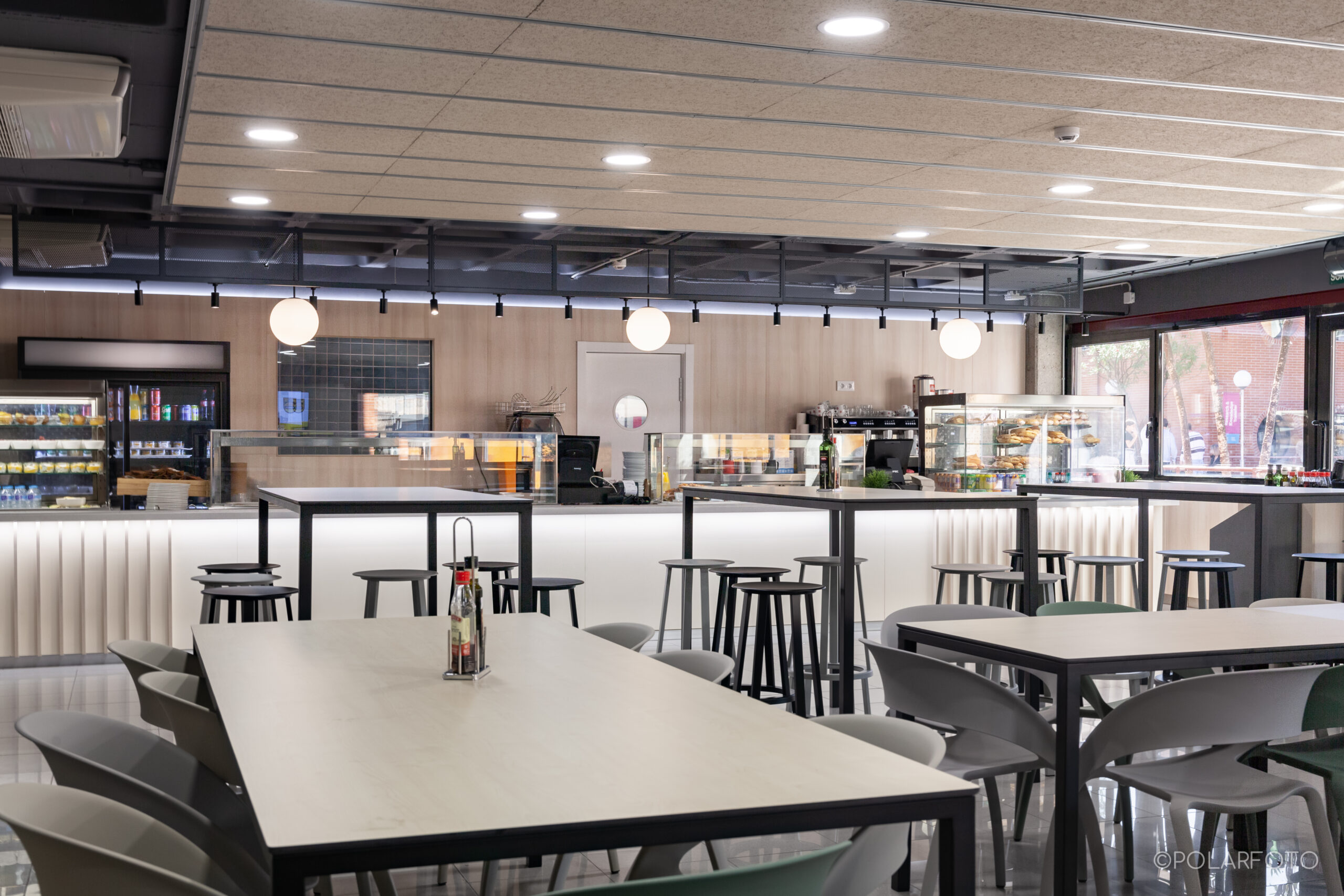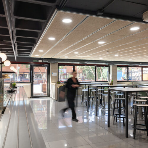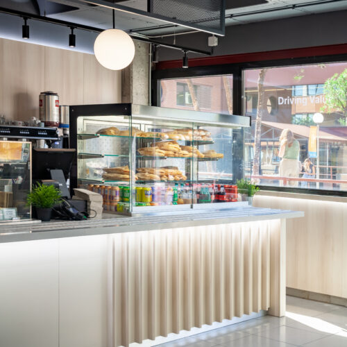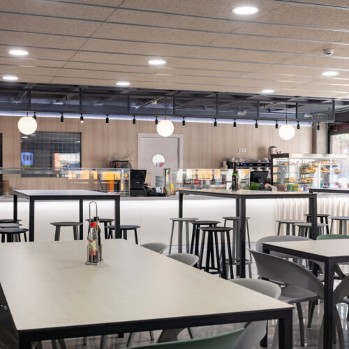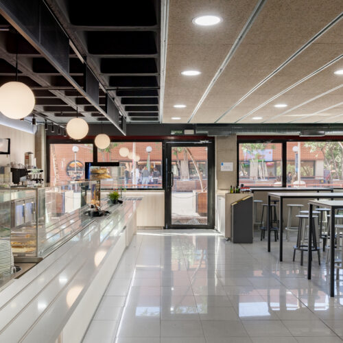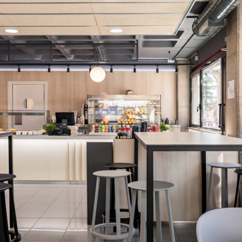 La reforma de esta cafetería universitaria busca transformar un espacio funcional y desgastado en un entorno luminoso, ordenado y contemporáneo, capaz de absorber con eficiencia el flujo constante de estudiantes. El proyecto trabaja con una paleta de materiales neutra cmo maderas claras, superficies blancas retroiluminadas y pavimento cerámico brillante para maximizar la percepción de higiene y claridad visual.