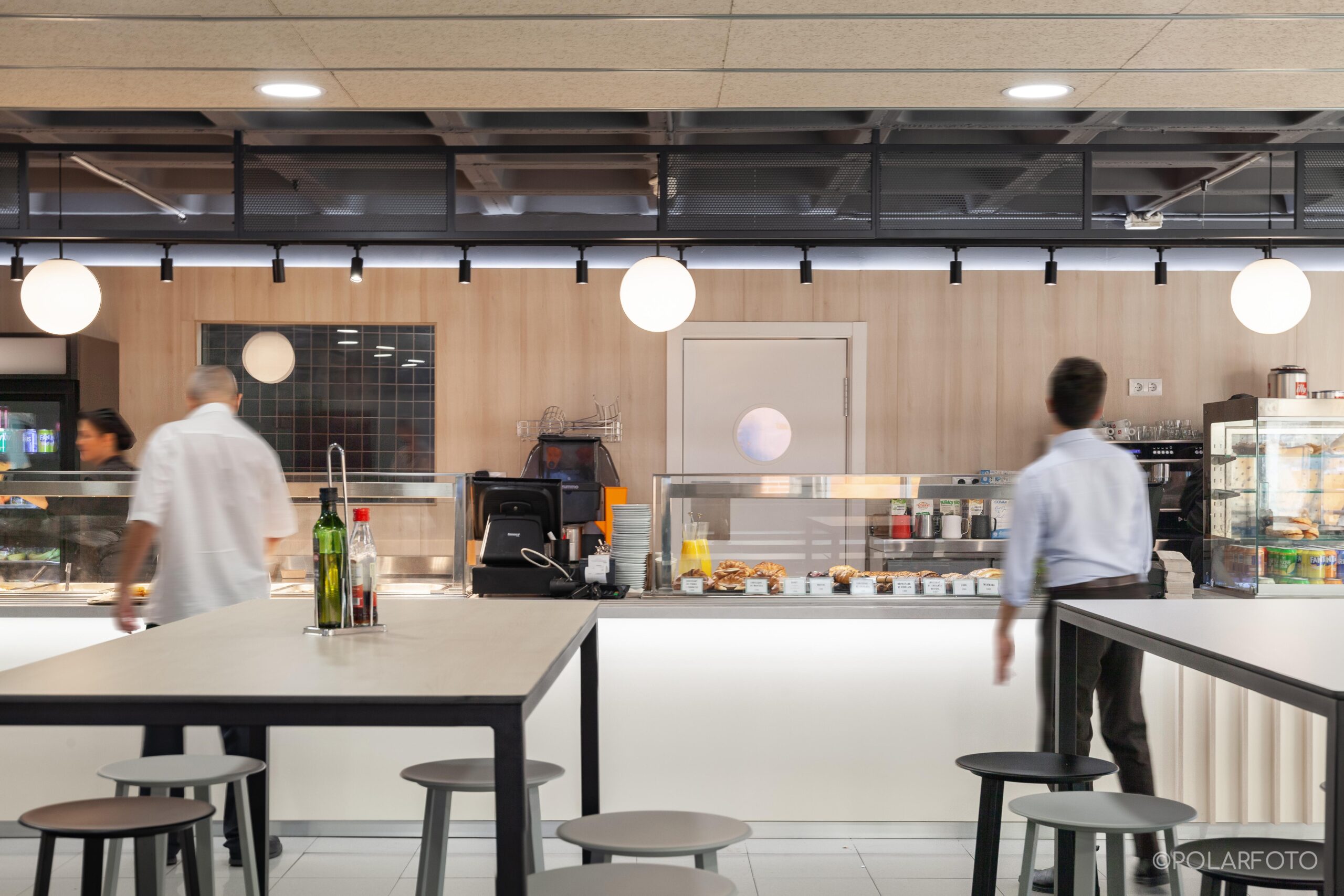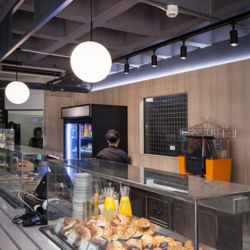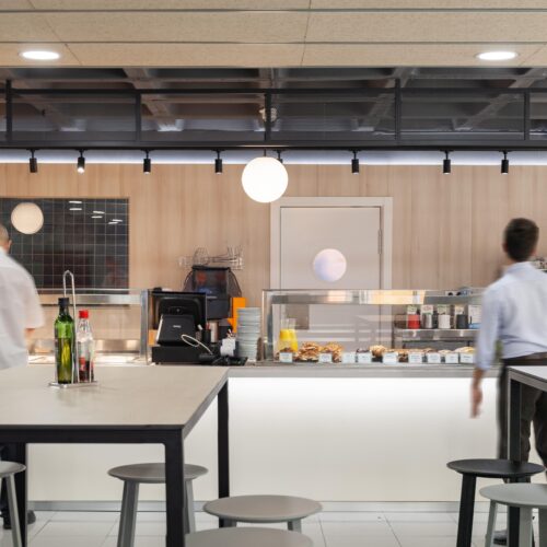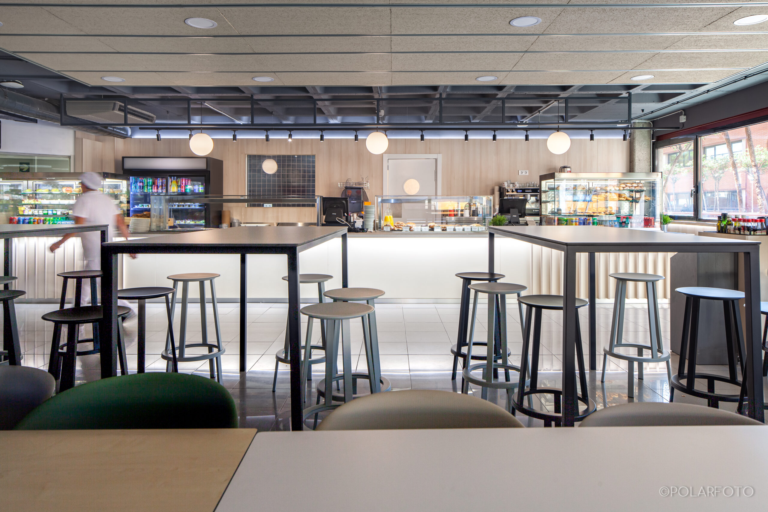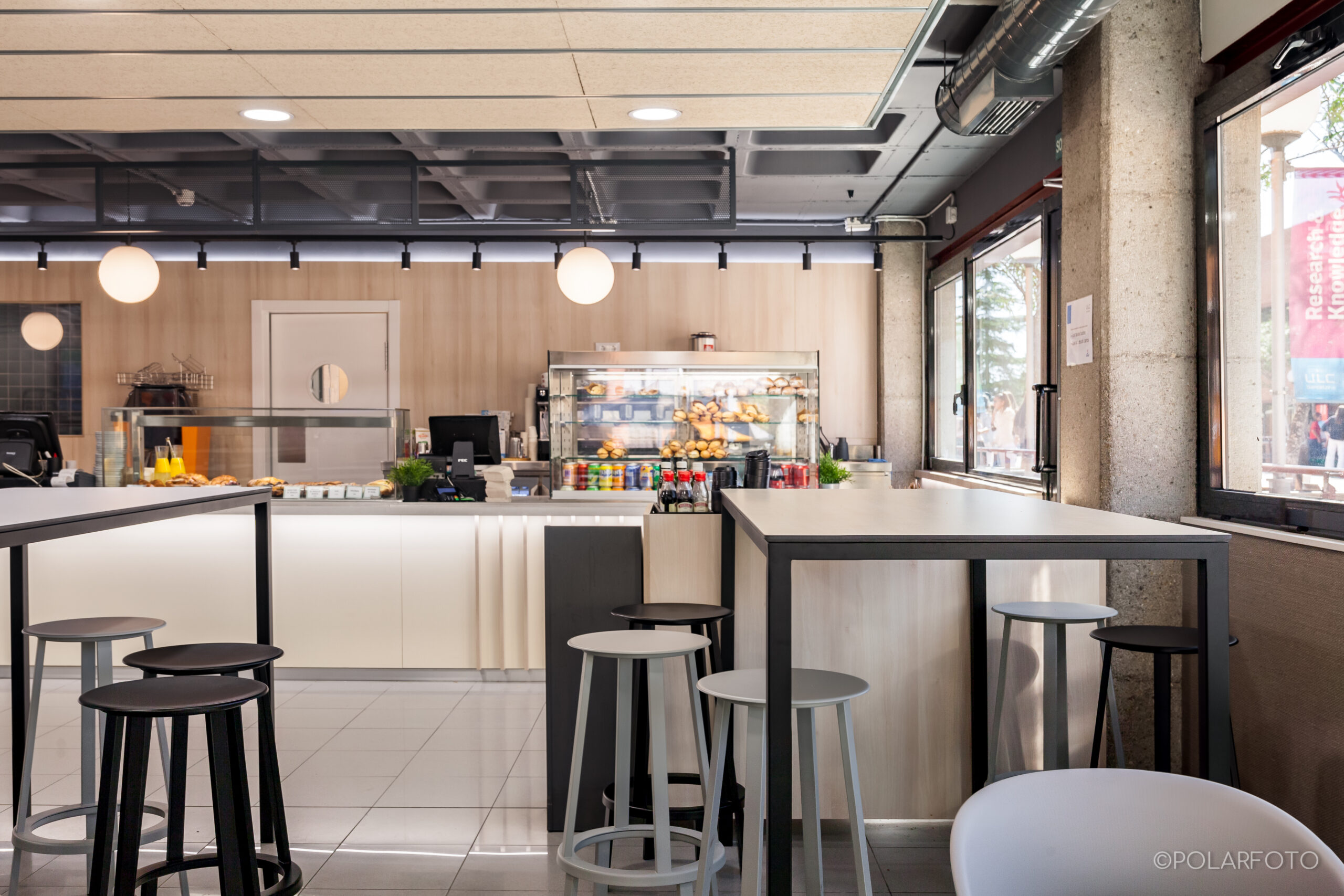 La reforma de esta cafetería universitaria busca transformar un espacio funcional y desgastado en un entorno luminoso, ordenado y contemporáneo, capaz de absorber con eficiencia el flujo constante de estudiantes. El proyecto trabaja con una paleta de materiales neutra cmo maderas claras, superficies blancas retroiluminadas y pavimento cerámico brillante para maximizar la percepción de higiene y claridad visual.
