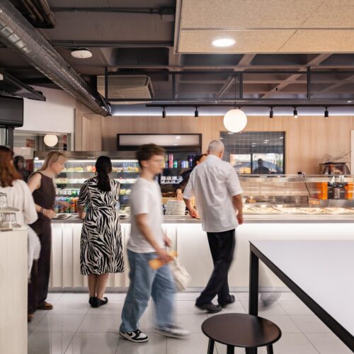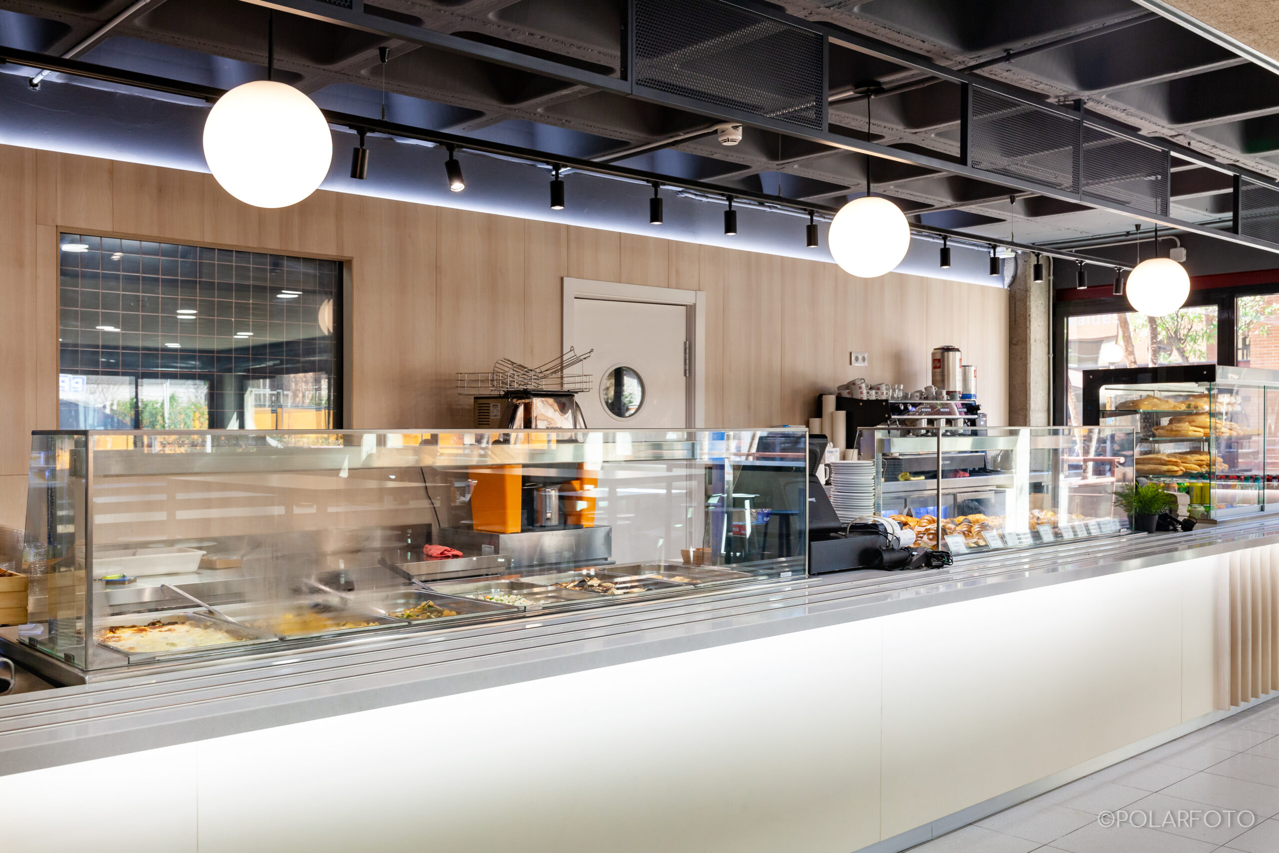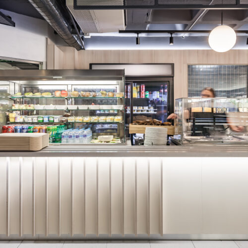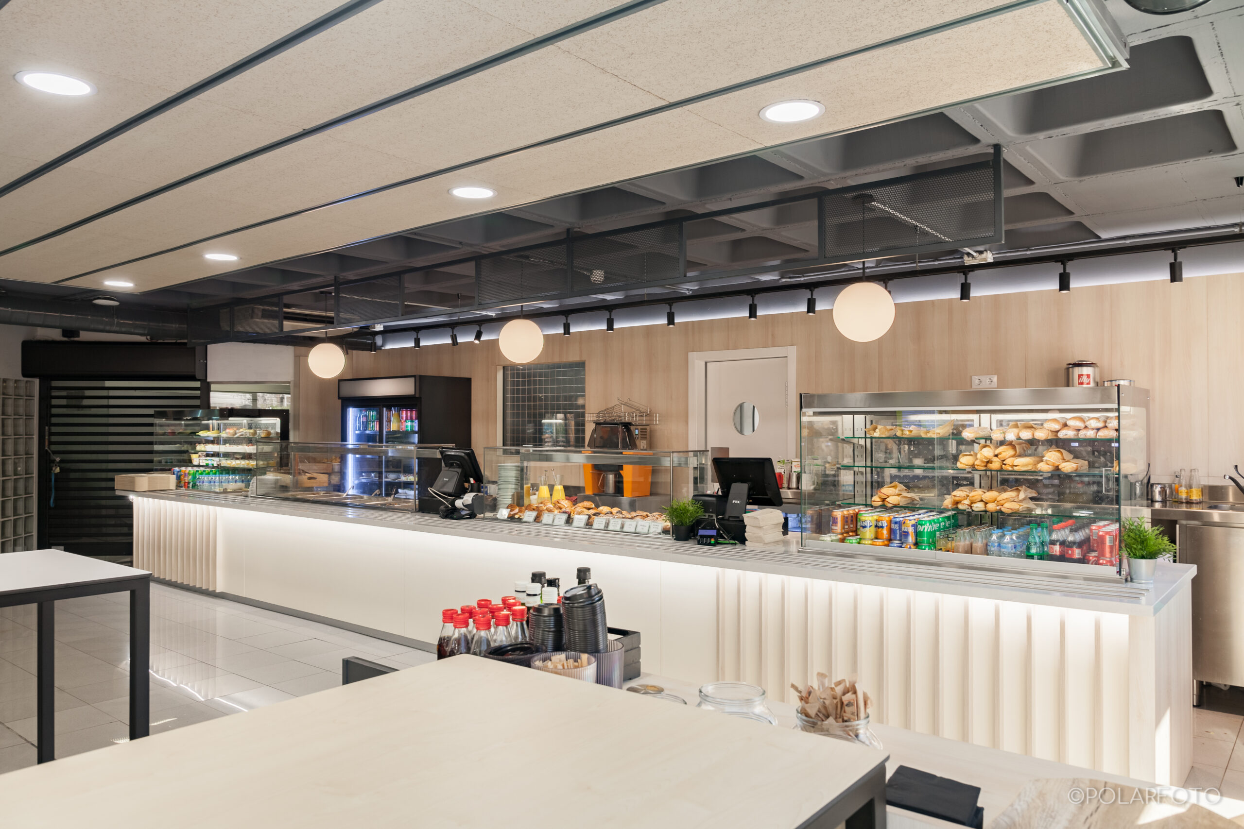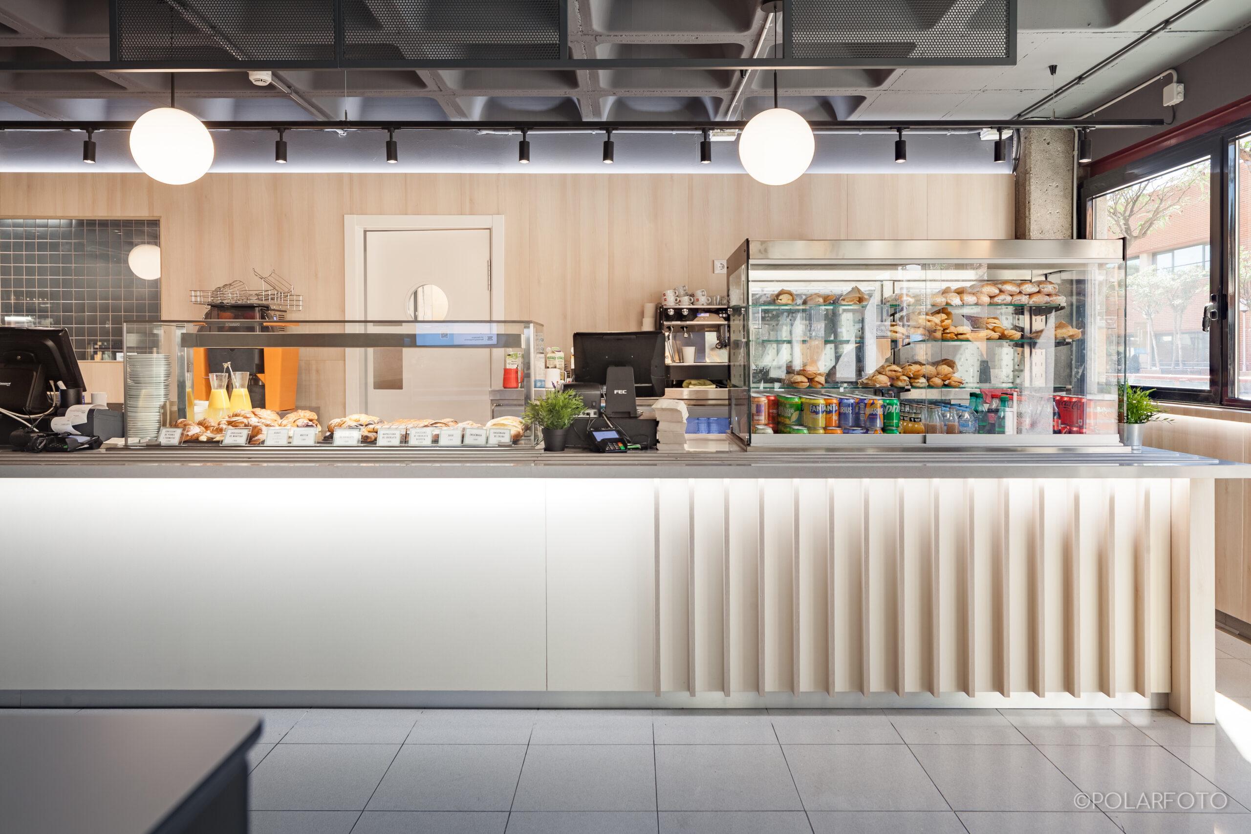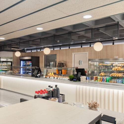 La reforma de esta cafetería universitaria busca transformar un espacio funcional y desgastado en un entorno luminoso, ordenado y contemporáneo, capaz de absorber con eficiencia el flujo constante de estudiantes. El proyecto trabaja con una paleta de materiales neutra cmo maderas claras, superficies blancas retroiluminadas y pavimento cerámico brillante para maximizar la percepción de higiene y claridad visual.