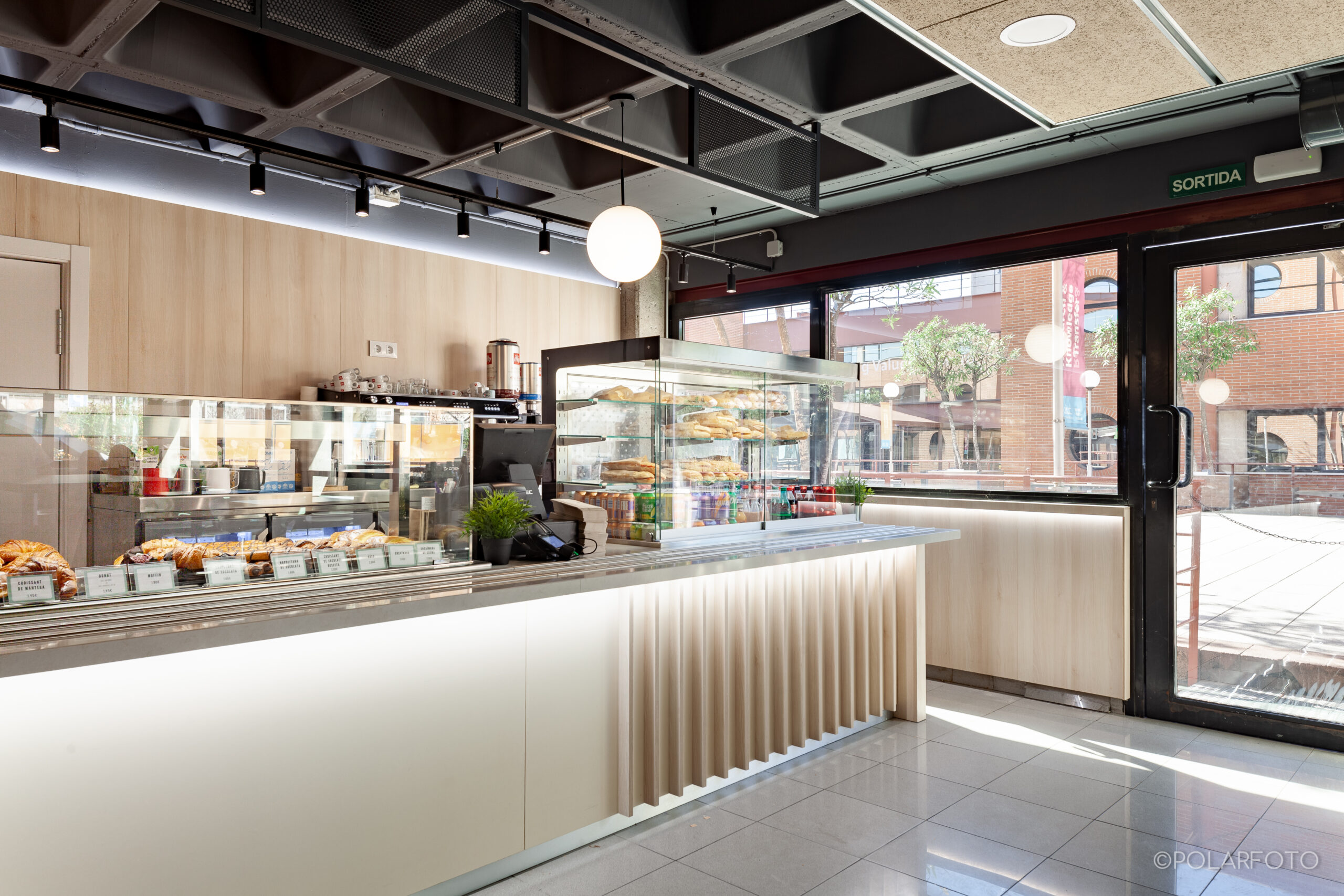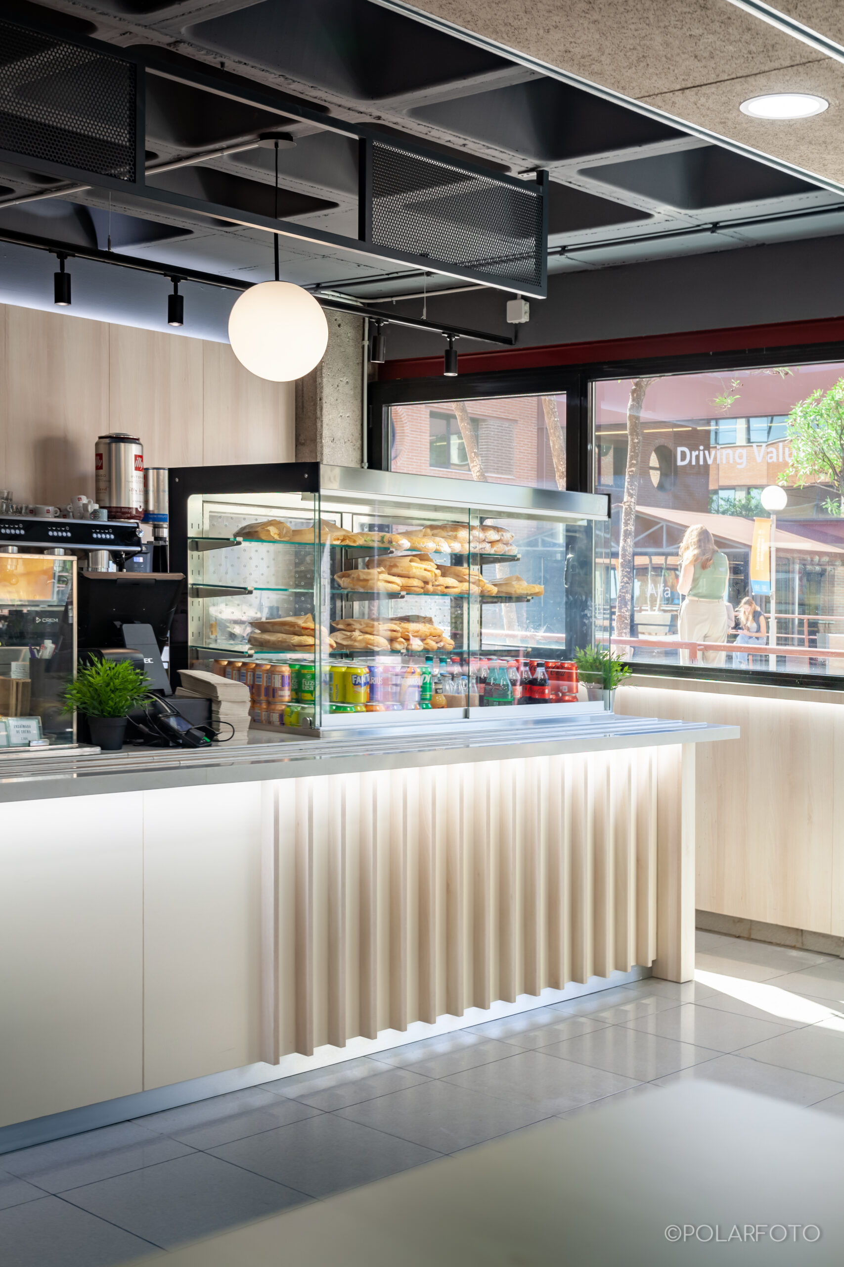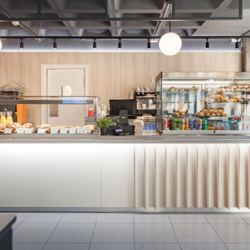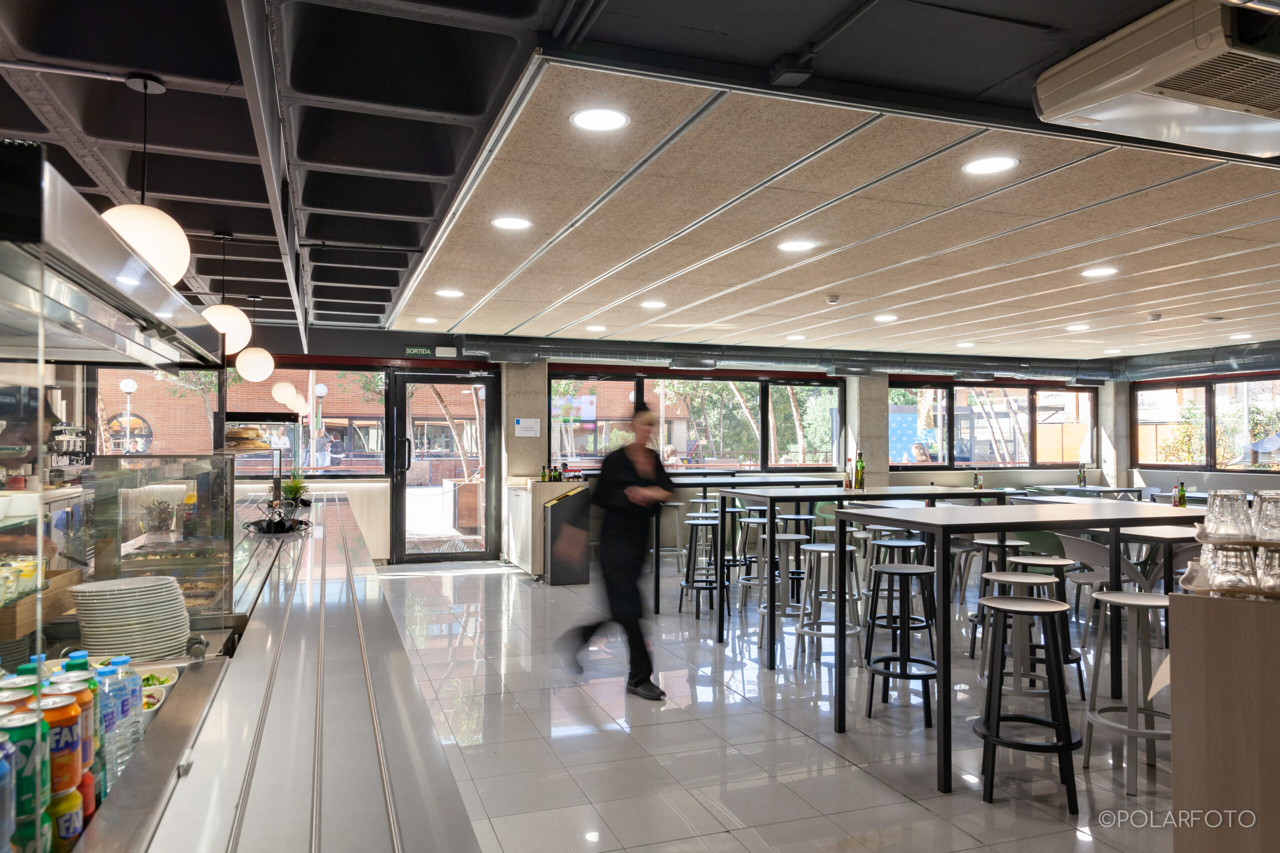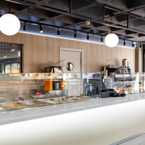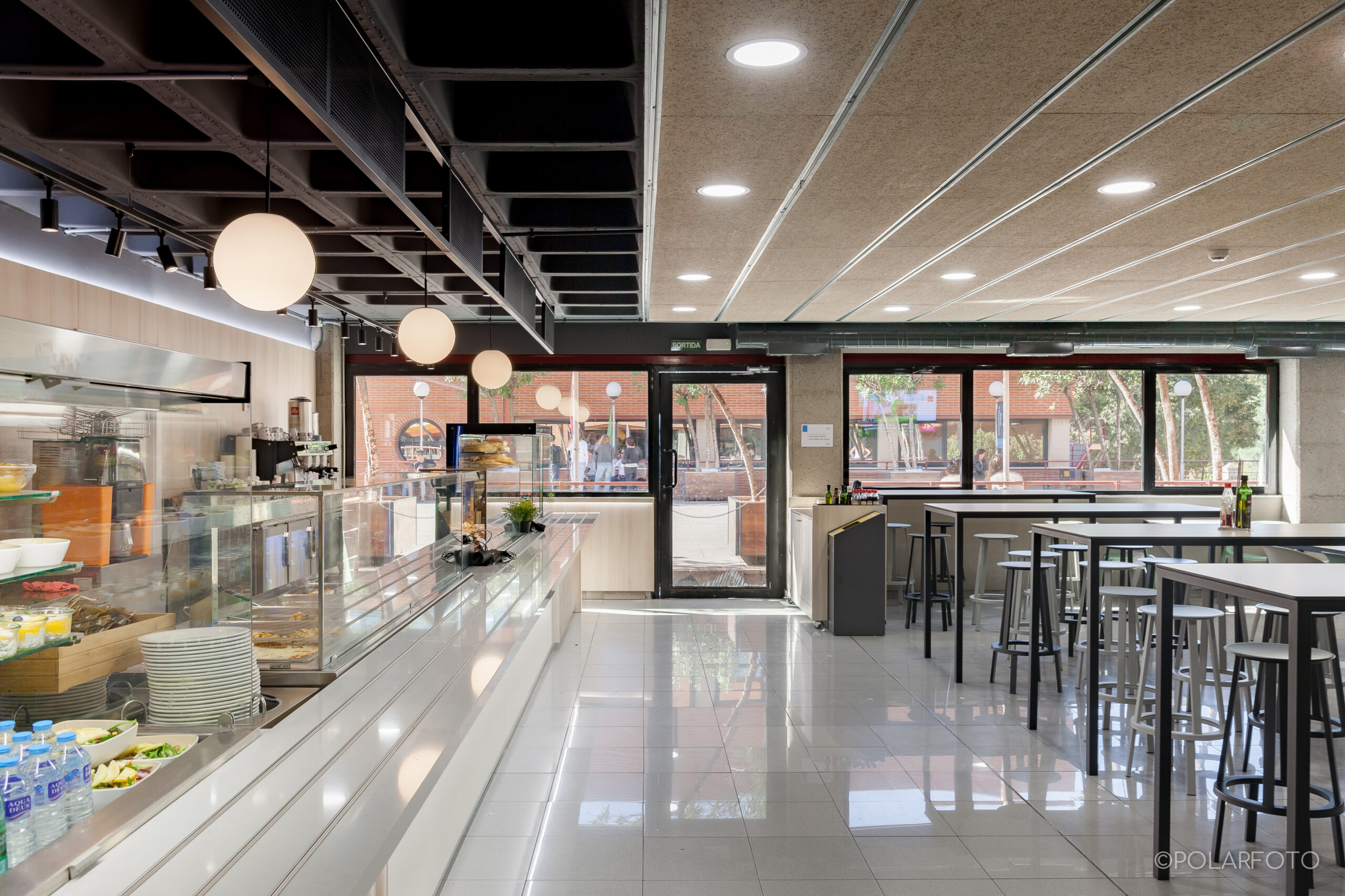 La reforma de esta cafetería universitaria busca transformar un espacio funcional y desgastado en un entorno luminoso, ordenado y contemporáneo, capaz de absorber con eficiencia el flujo constante de estudiantes. El proyecto trabaja con una paleta de materiales neutra cmo maderas claras, superficies blancas retroiluminadas y pavimento cerámico brillante para maximizar la percepción de higiene y claridad visual.