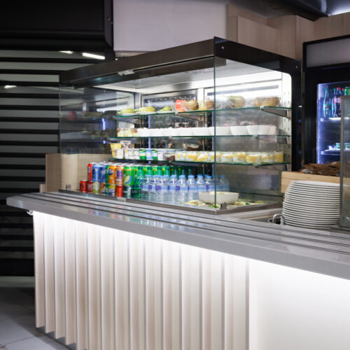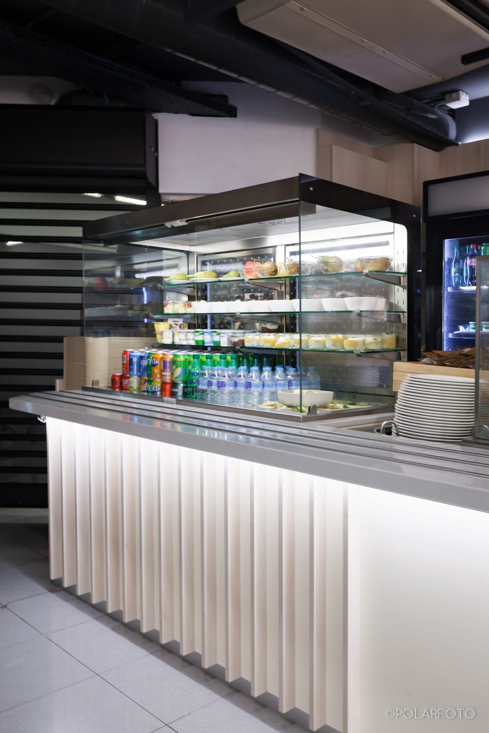 La barra principal se concibe como un volumen continuo y limpio, enfatizado por una iluminación lineal inferior que aporta ligereza y guía el recorrido del usuario.